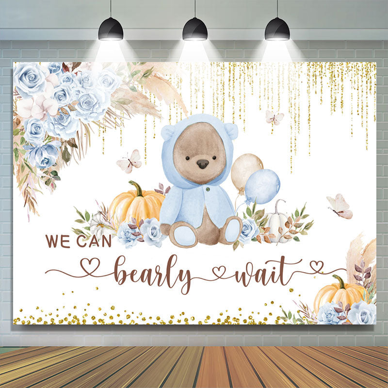 Blau Blumen Teddy Tragen Gold Funkeln Babydusche Hintergrund