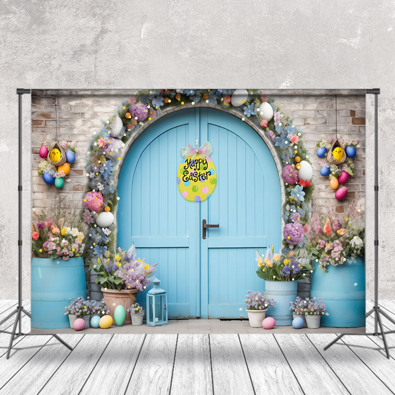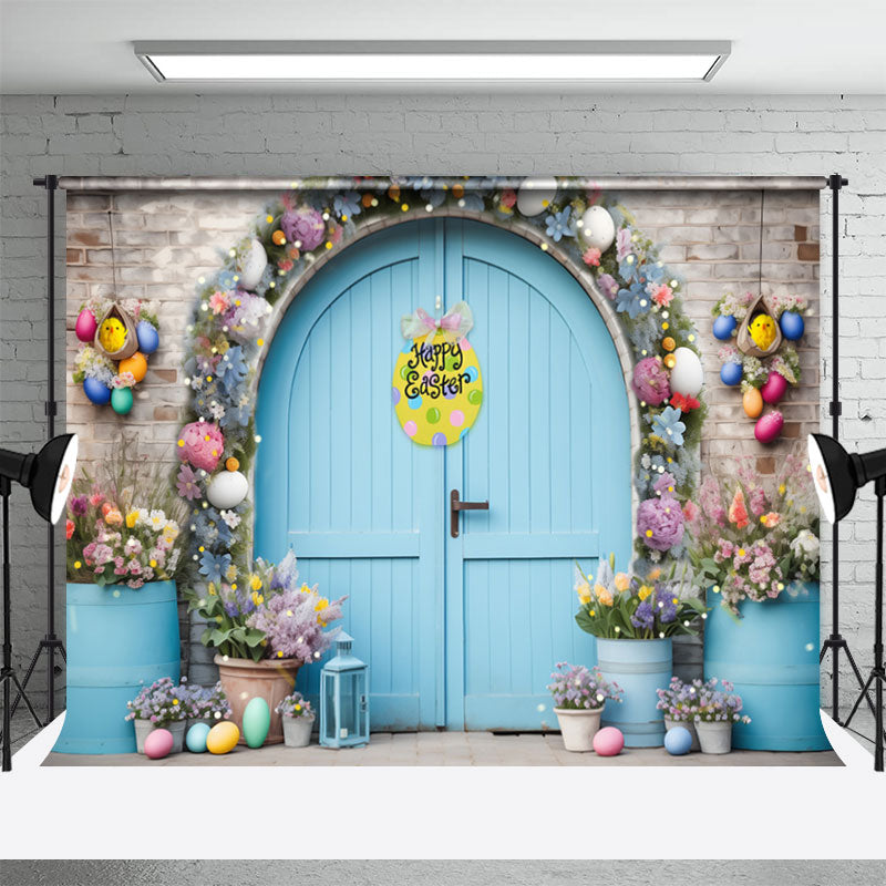 Blau Tür Ziegel Wand Blumen Glücklich Ostern Hintergrund