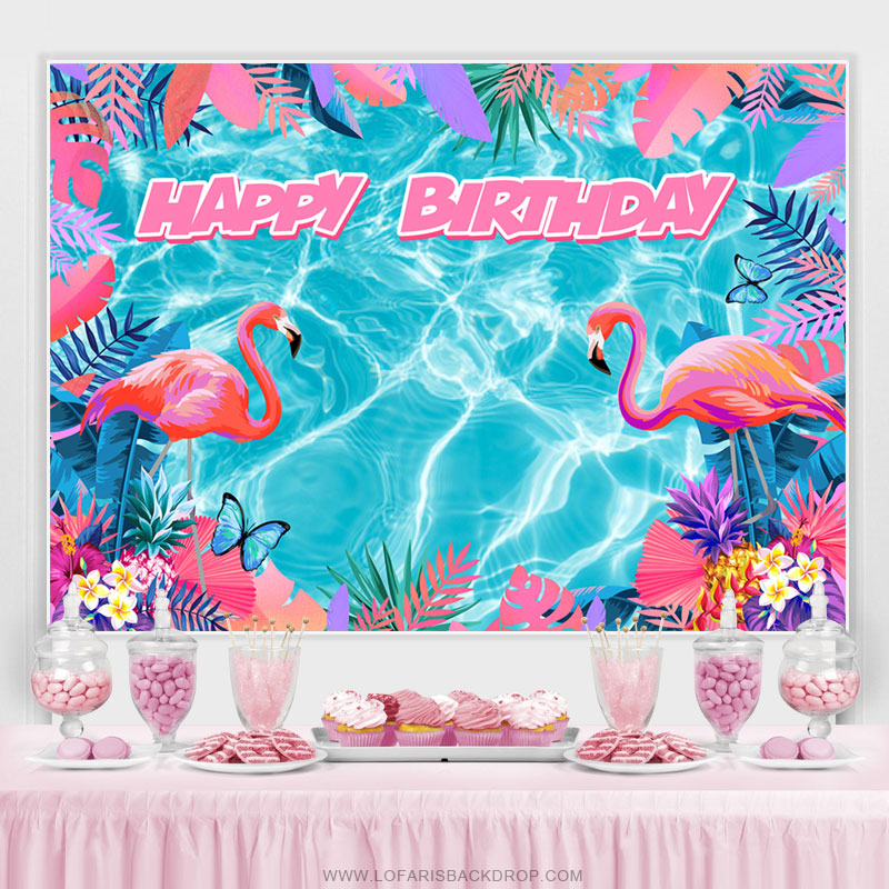 Blauer wasserrosa Flamingo Monstera Geburtstagshintergrund