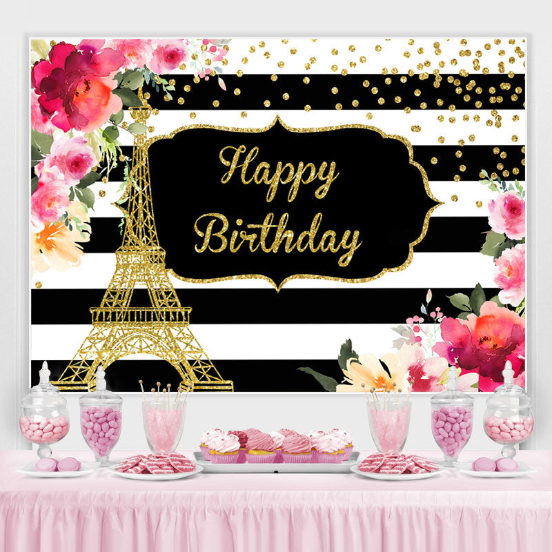 Blumen Und Gold Eiffel Turm Glücklich Geburtstag Hintergrund