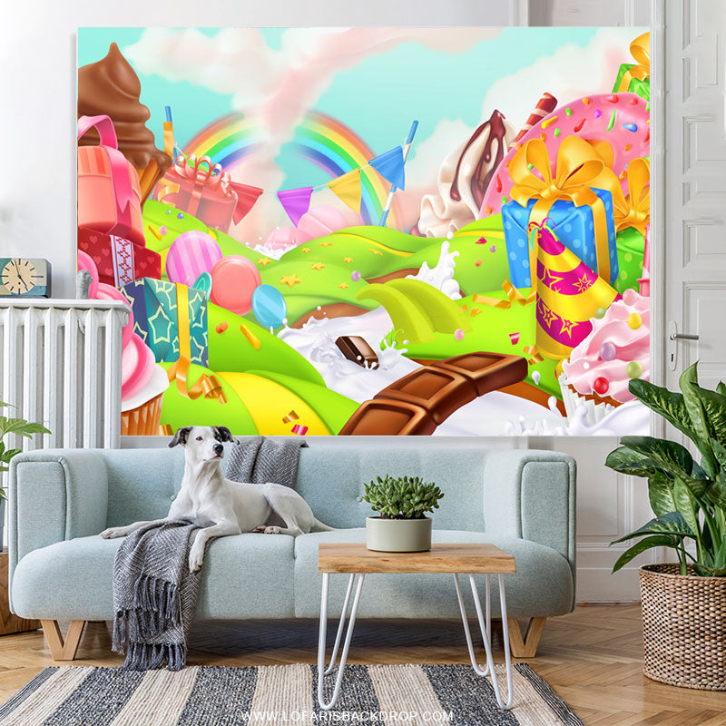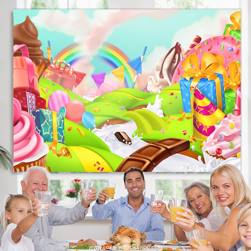 Karikatur Regenbogen Nachtisch Süßigkeitenland Geburtstagshintergrund