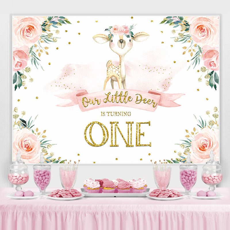 Eins Wurf Reh Ist Drehen Rosa Blumen Hintergrund für Erste Geburtstag