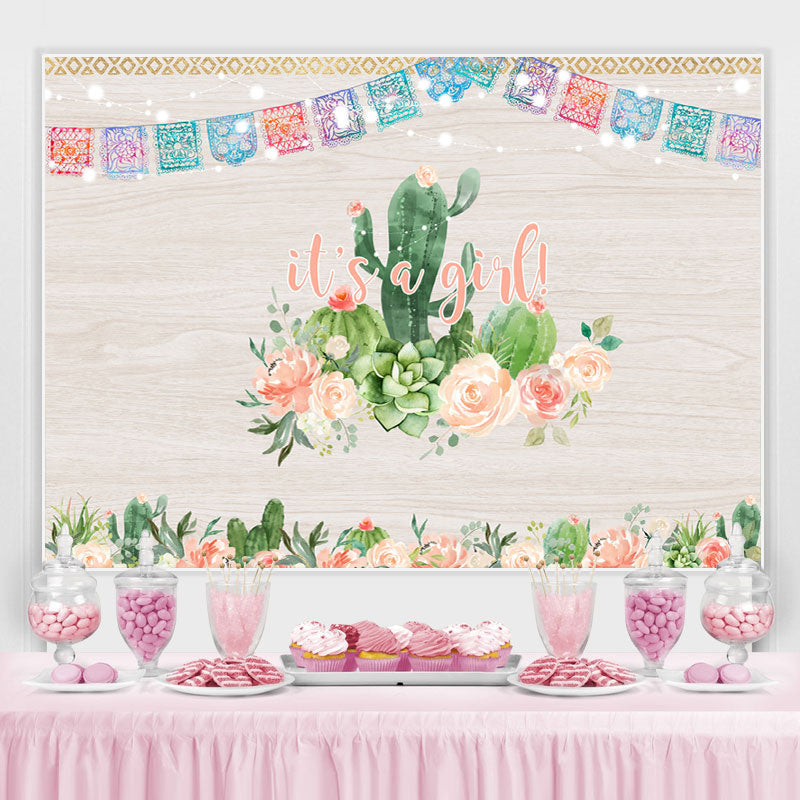 Es ist A Mädchen Kaktus Und Blumen Holz Baby Dusche Hintergrund