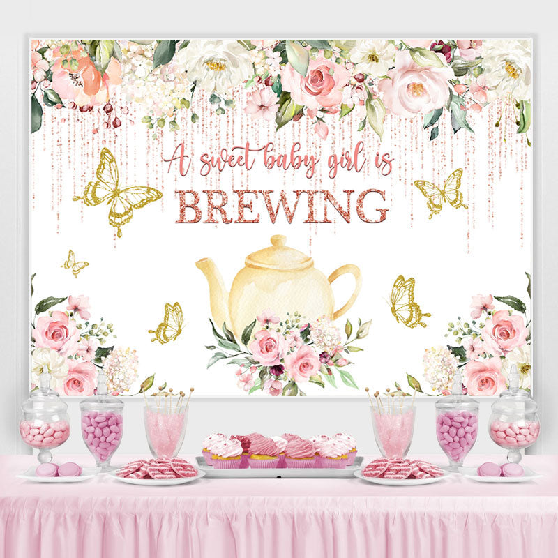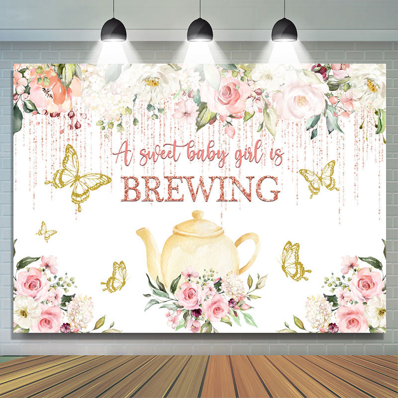 Gelb Teekanne Und Golden Schmetterling babydusche Hintergrund
