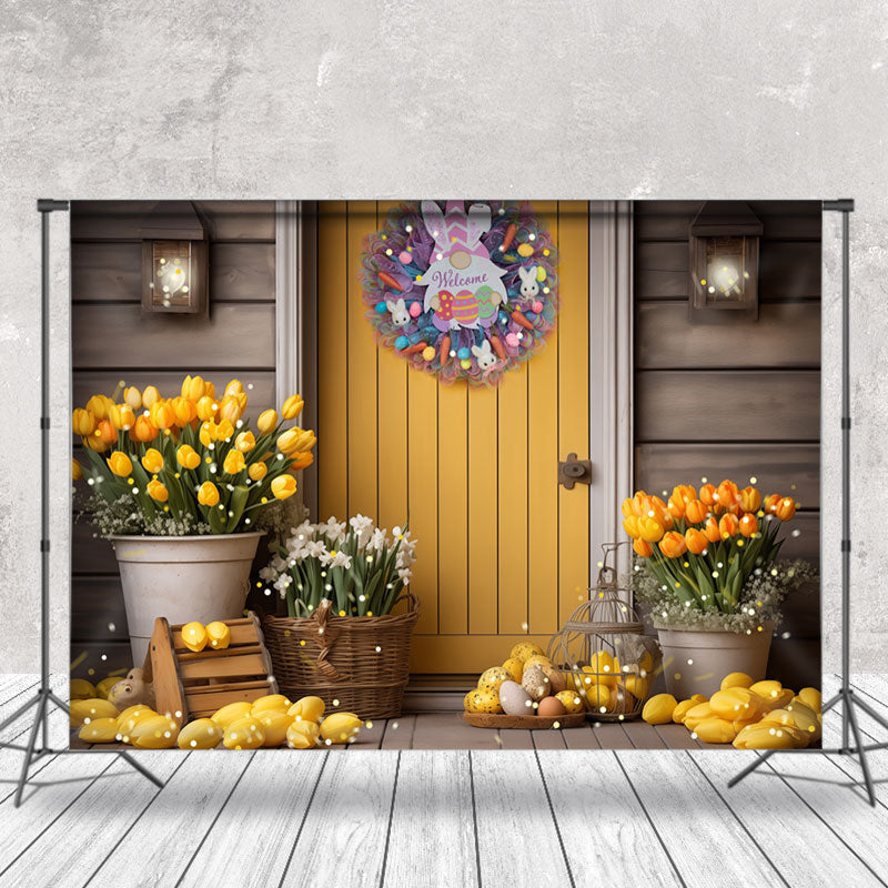 Gelb Tür Blumen Kaninchen Kranz Ostern Hintergrund