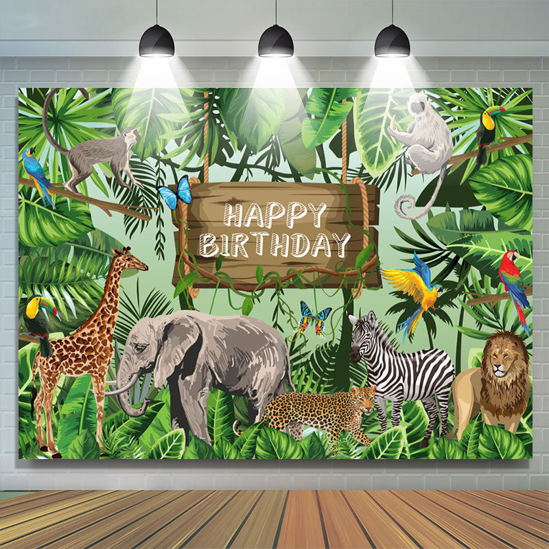 Grüne Safari Tiere Pflanzen Happy Birthday Hintergrund