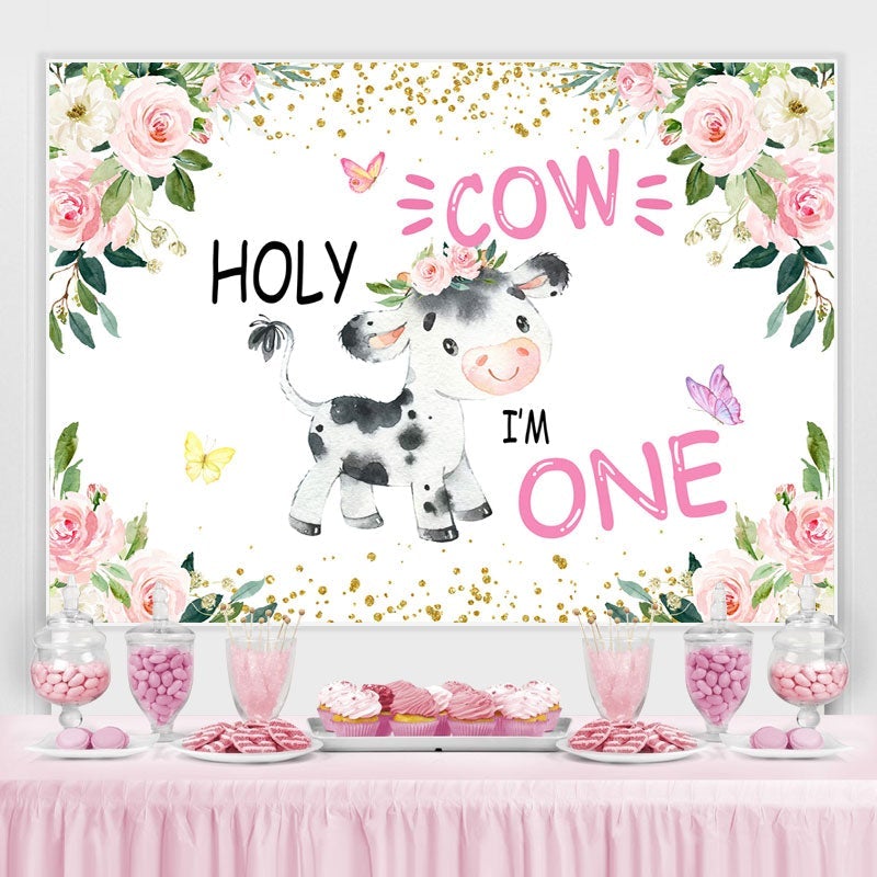 Heilig Kuh Rosa Blumen Gold Funkeln Erste Geburtstag Hintergrund für Mädchen