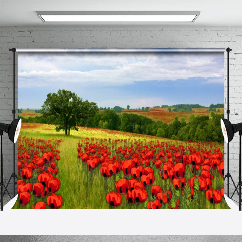 Hell Rot Blumen Grün Bäume Feld Frühling Hintergrund
