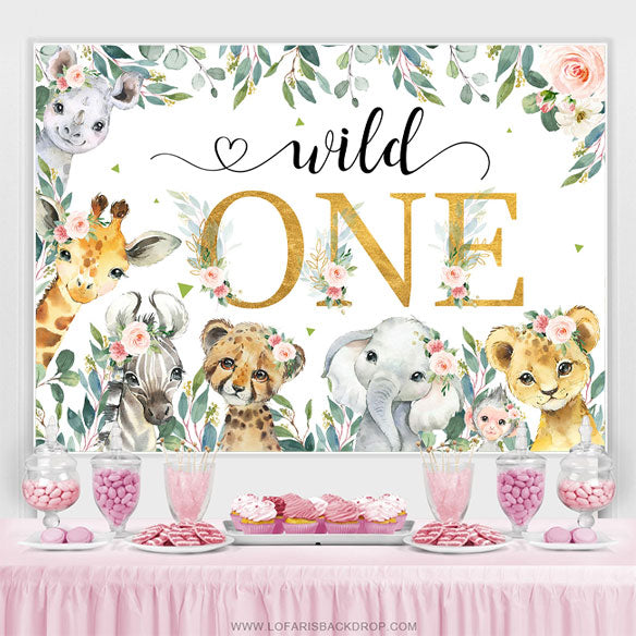 Hintergrund mit Blumenblättern und wilden Tieren zum 1. Geburtstag