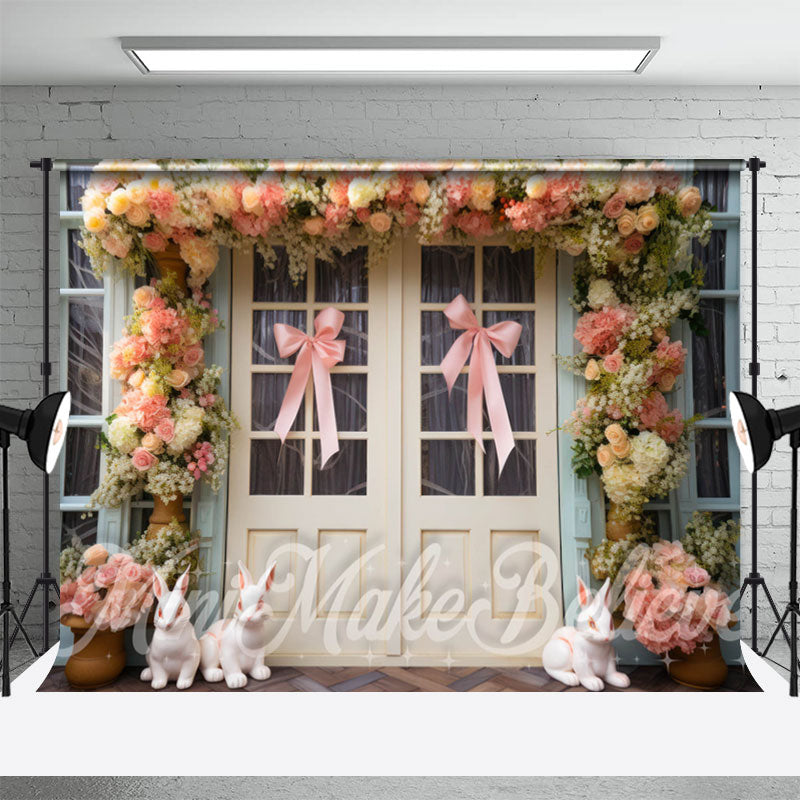 Hölzern Tür Bogen Binden Kaninchen Blumen Ostern Hintergrund