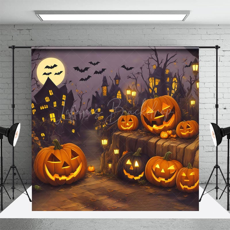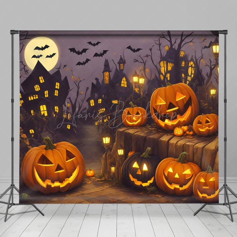Kürbis Schläger Mond Dorf Glücklich Halloween Nacht Hintergrund