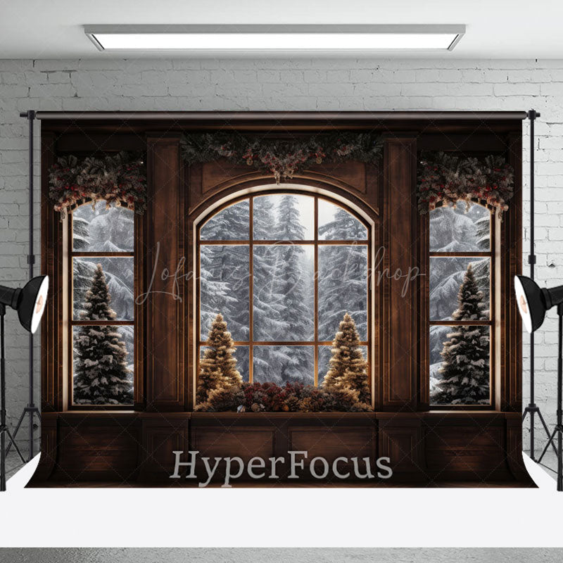 Lofaris Braun Fenster Schneebedeckt Wald Szene Weihnachten Hintergrund
