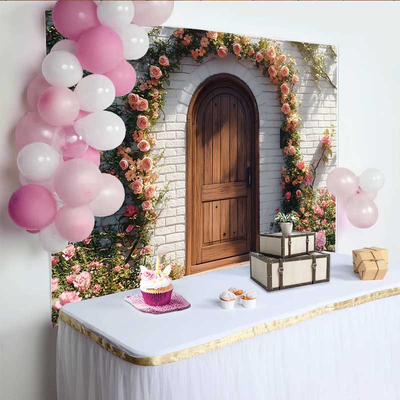 Lofaris Fotohintergrund Frühling Rustikale Holztür Rosa Rosen Blumenbogen Party Dekoration