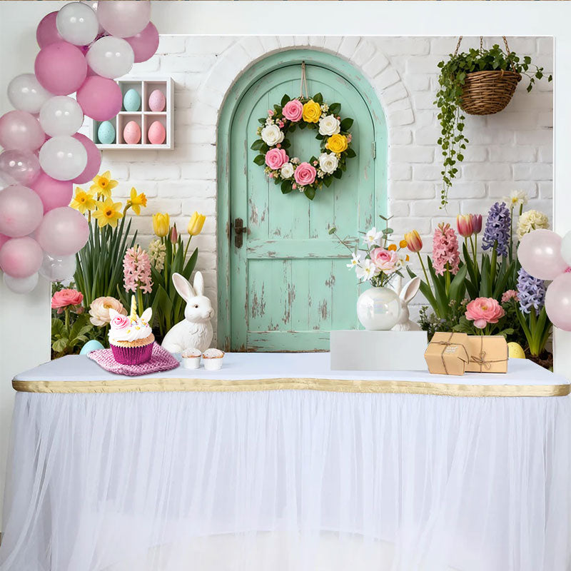 Lofaris Frühlingshafter Osterhintergrund mit Hasen und Eiern, mintgrüner Tür und Blumenkranz, für Fotoshootings