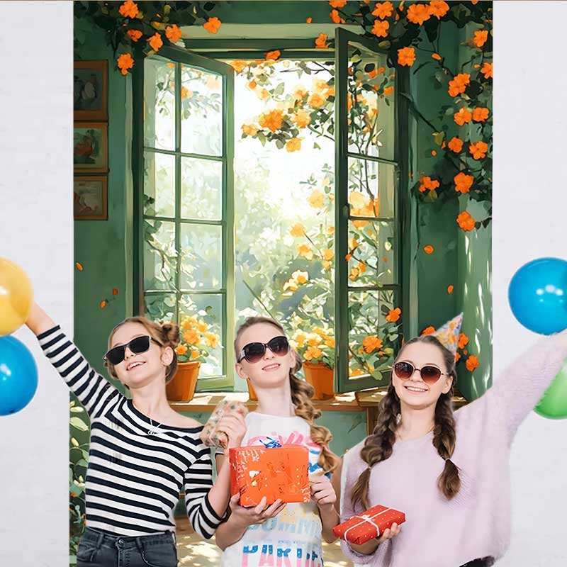 Lofaris Frühlingsfenster Hintergrund Orange Blumen Holzschemel