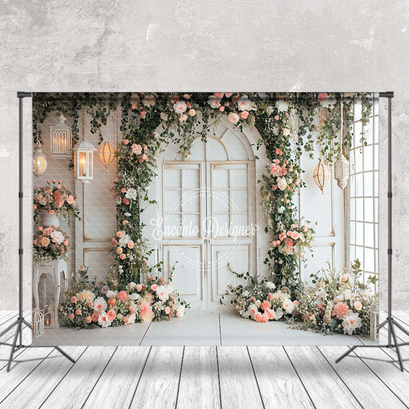 Romantisch Rosa Blumen Weiß Tür Hochzeit Hintergrund