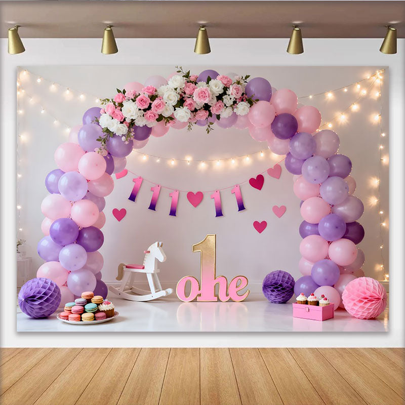 Rosa Lila Ballon Erster Geburtstag Cake Smash Hintergrund Blumen EINS Lichterkette
