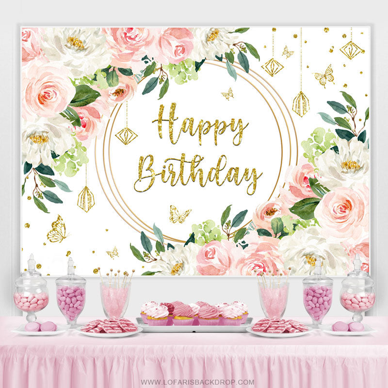 Rosa Weiss Blumen Gold Funkeln Glücklich Geburtstag Hintergrund