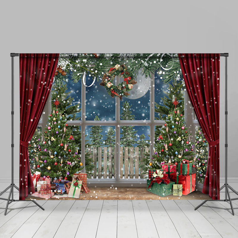 Schneebedeckt Weihnachten Bäume Mit Geschenke Rot Vorhang Hintergrund