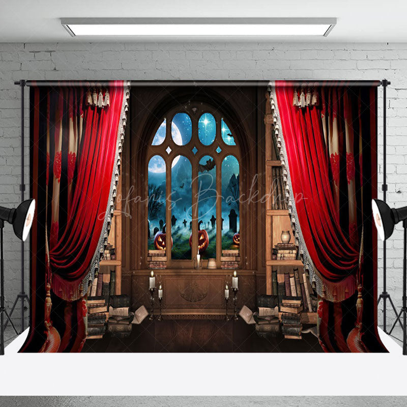 Vorhang Bücherregal Kerze Kürbis Halloween Hintergrund