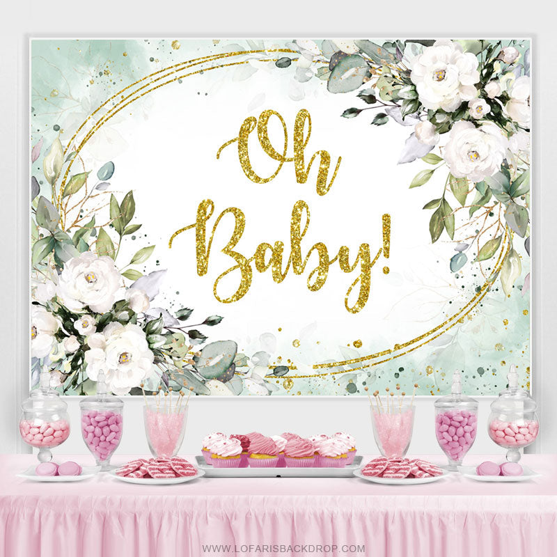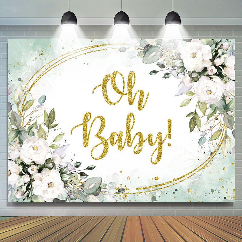 Weiß Blumen Und Grün Blätter Gold Baby Dusche Hintergrund