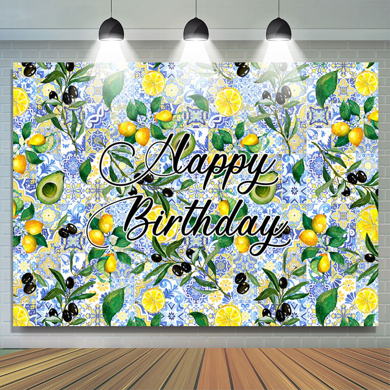 Zitronen Avocado Blau Geburtstagshintergrund mit zartem Muster